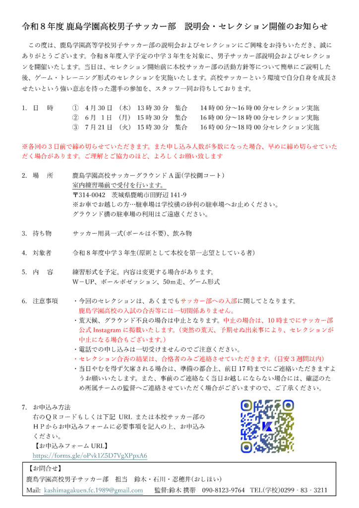 この度は、鹿島学園高等学校男子サッカー部の説明会およびセレクションにご興味をお持ちいただき、誠にありがとうございます。令和8年度入学予定の中学3 年生を対象に、男子サッカー部説明会およびセレクションを開催いたします。当日は、セレクション開始前に本校サッカー部の活動方針等について簡単にご説明した後、ゲーム・トレーニング形式のセレクションを実施いたします。高校サッカーという環境で自分自身を成⾧させたいという強い意志を持った選手の参加を、スタッフ一同お待ちしております。